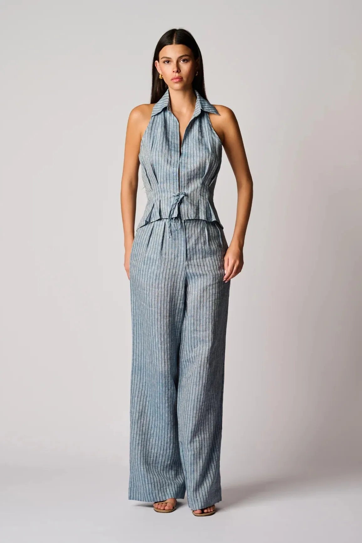 Designed in our signature 100% linen, the Sloan Vest in indigo offers a flattering deep V spread collar over a loosely tailored silhouette. Precise center front pleating, a self-tie belt, and a hook-and-bar closure create a more fitted waist.