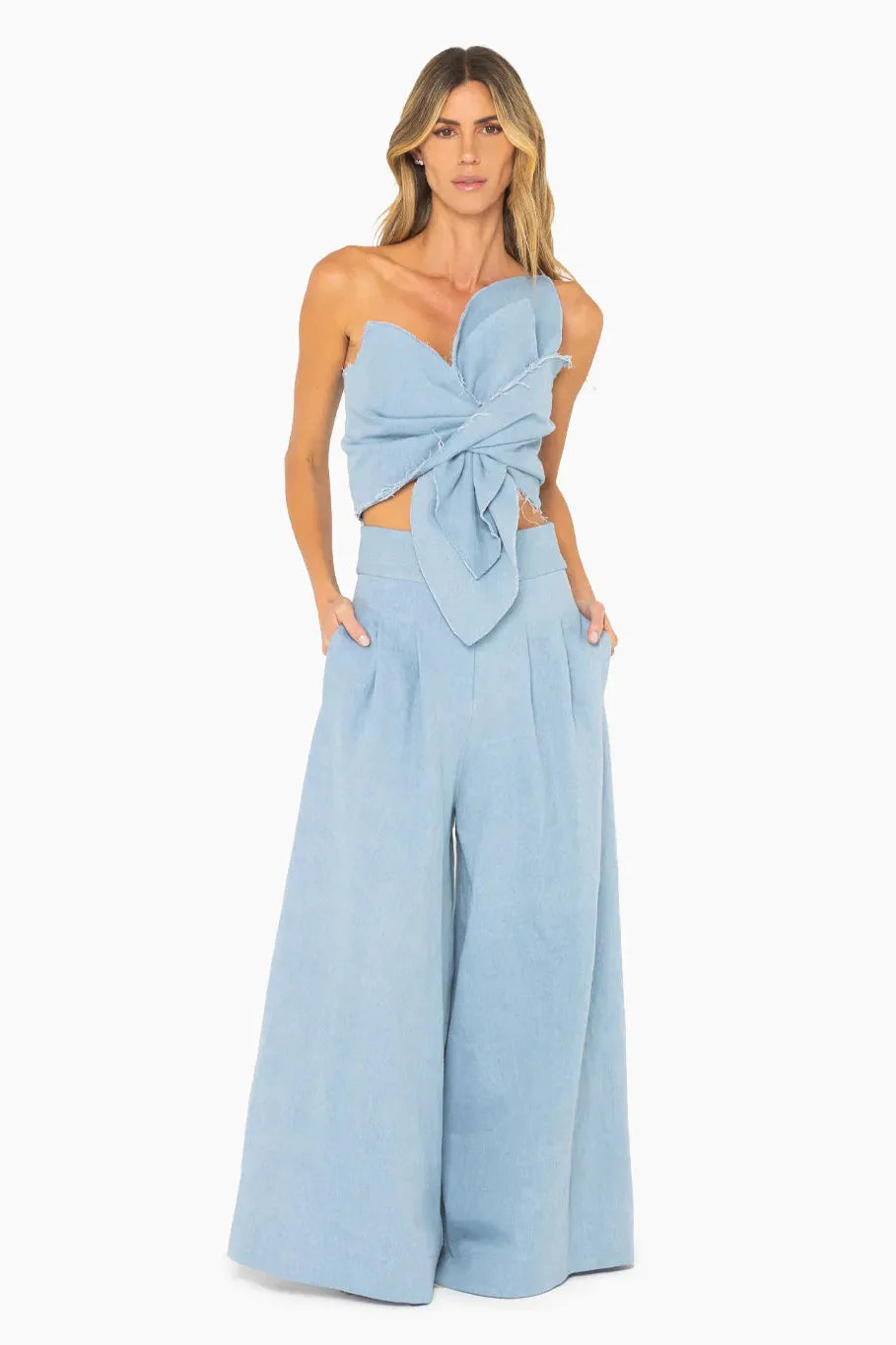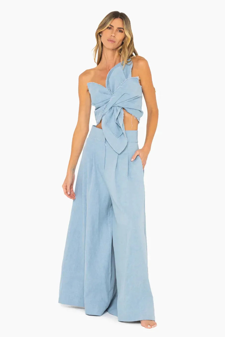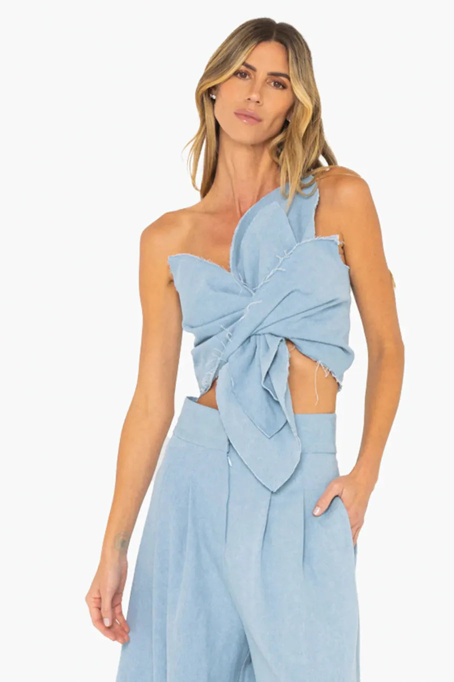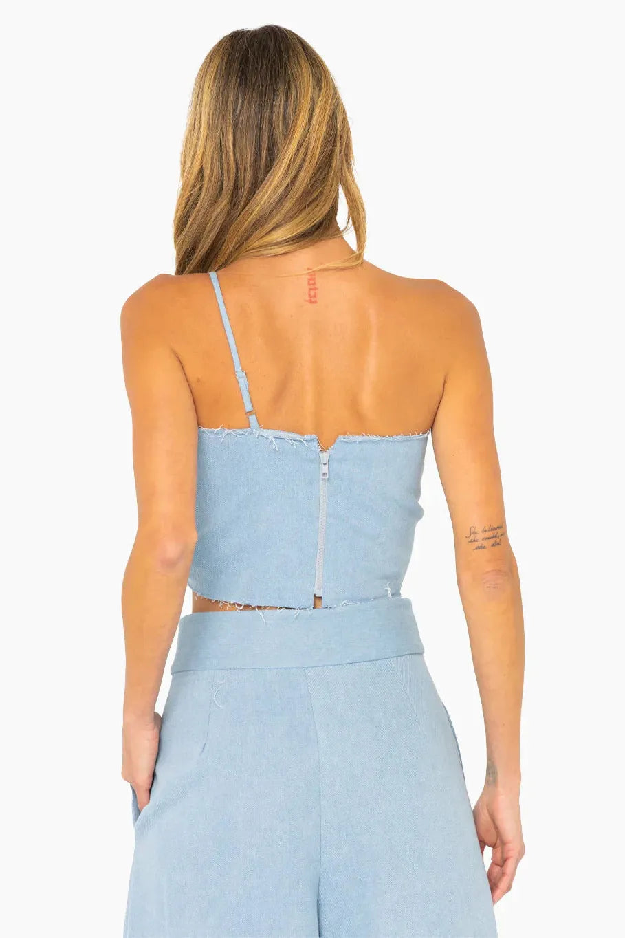 An enhanced take on our signature Sol Top. The Orchid Top is a statement piece with a twisted bralette silhouette and exaggerated peeks from shoulder to belly. The structured style features a spaghetti strap and a zipper at back. Designed to wear with our Logan Pant.