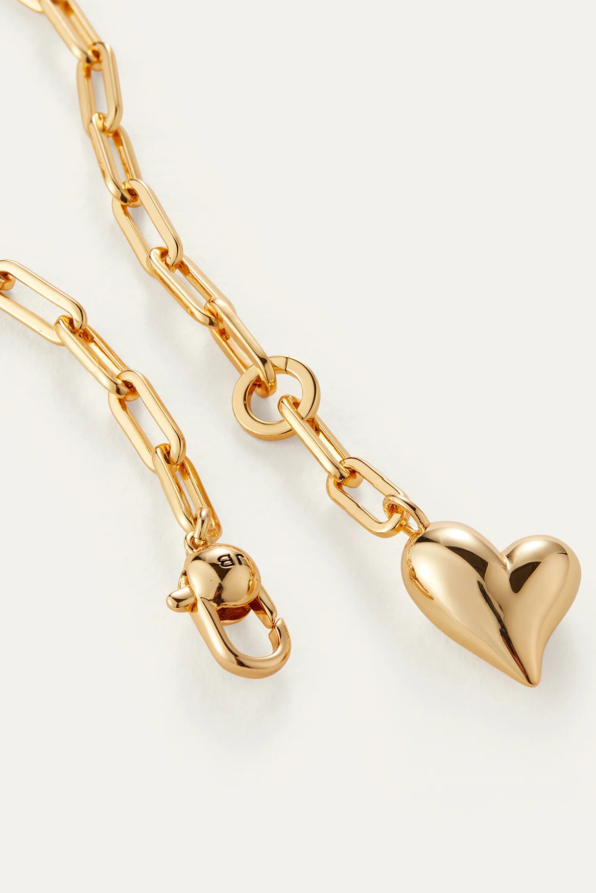 A joyful, inflated heart is suspended from a paperclip link chain necklace.