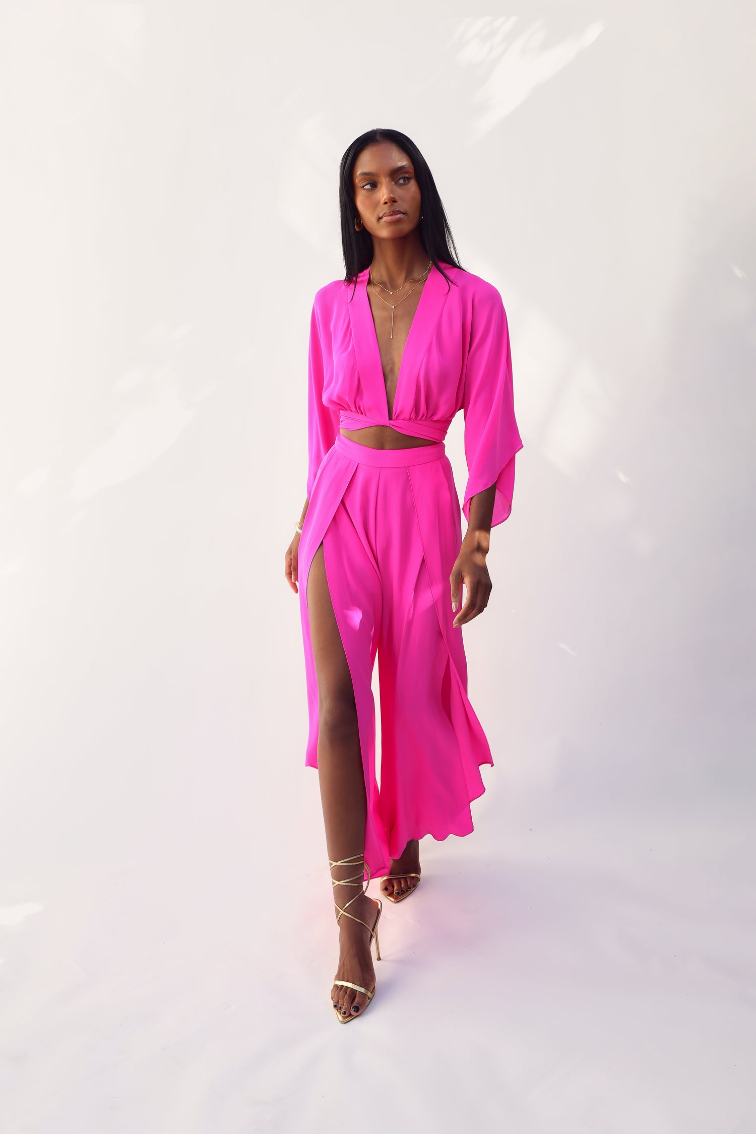 Fan favorite alert! Our Kimono Wrap Top is our most versatile and can be worn multiple ways. Style it as a true Kimono top with tie-front detail, pull ties behind and tie for a bolero style over any cocktail dress or wear it reversed for a chic, open-back crop top.