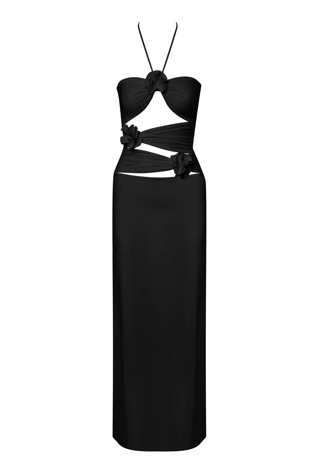 The Veranera is a flirty maxi dress with cutouts and floral-ruffle details. Dress up for an event with heels, or wear casually with sandals while on vacation.