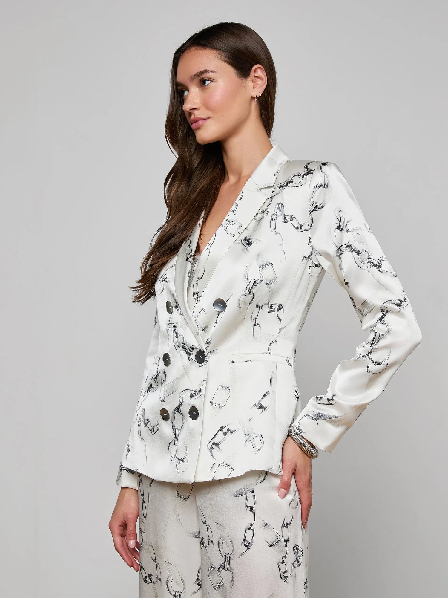 Subtle feminine shaping balances the crisp tailored details of the timeless Colin blazer. Double-breasted with gold buttons, it’s a tailored piece designed to go from desk-to-drinks in style. Now back in ivory with a chain print.