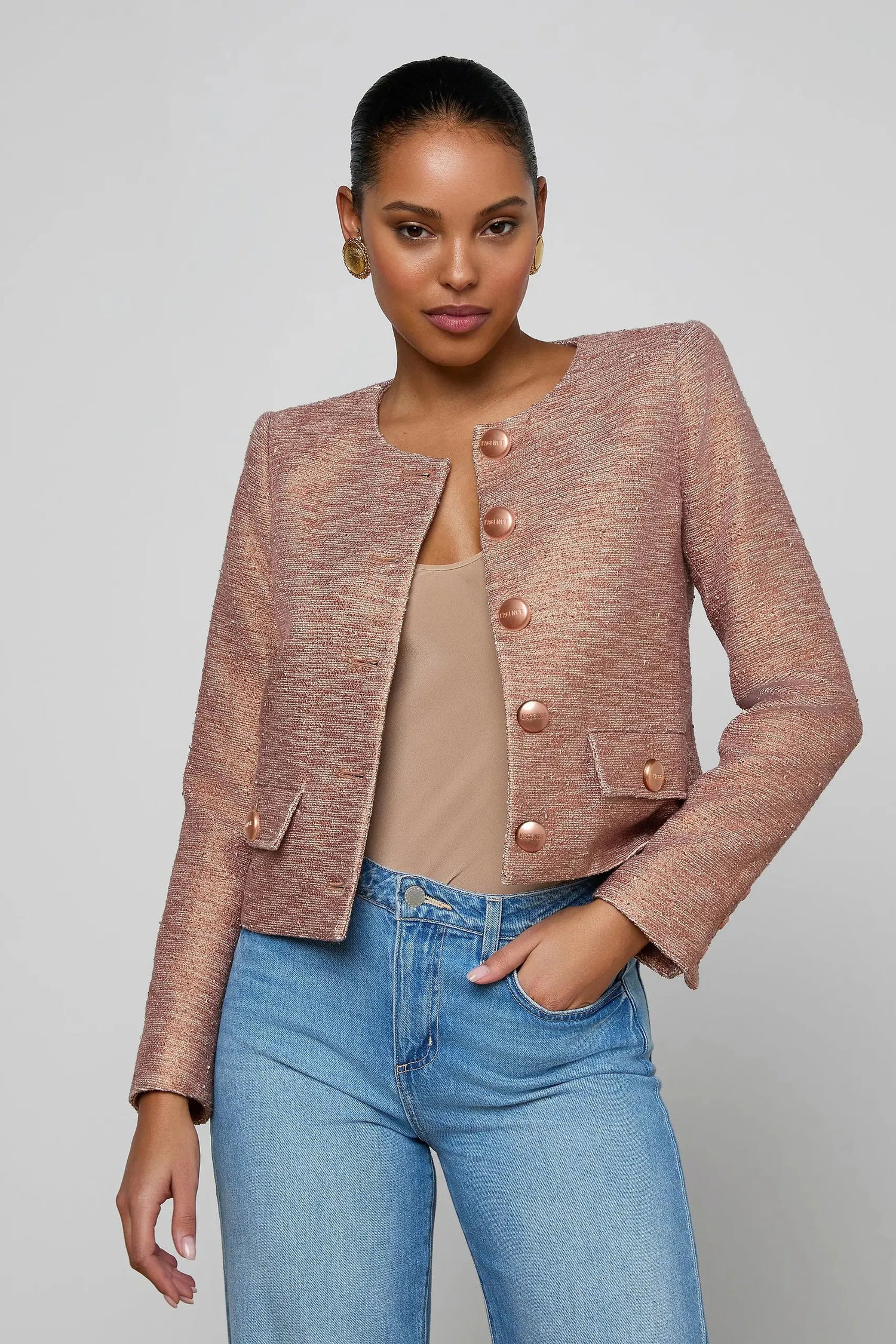 The Zell jacket returns with its signature collarless silhouette, refreshed in a textured slub tweed and finished with a coating that adds a glossy sheen. Style it over a simple tank and denim or pair it with a mini for cool-girl contrast.