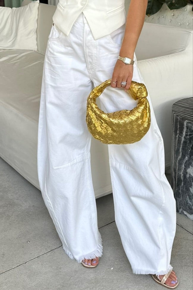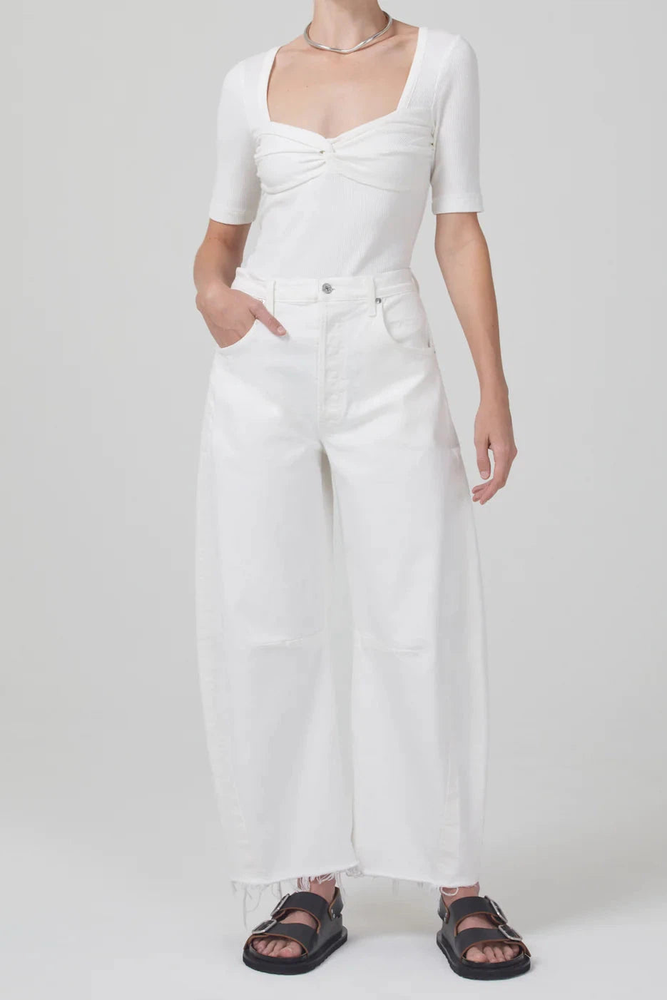 The Horseshoe Jeans are a tapered baggy denim. These fashion jeans have a curved, wide-leg fit that fall slightly tapered and cropped. The fit is intended to be relaxed. Size down for a higher, closer fit.