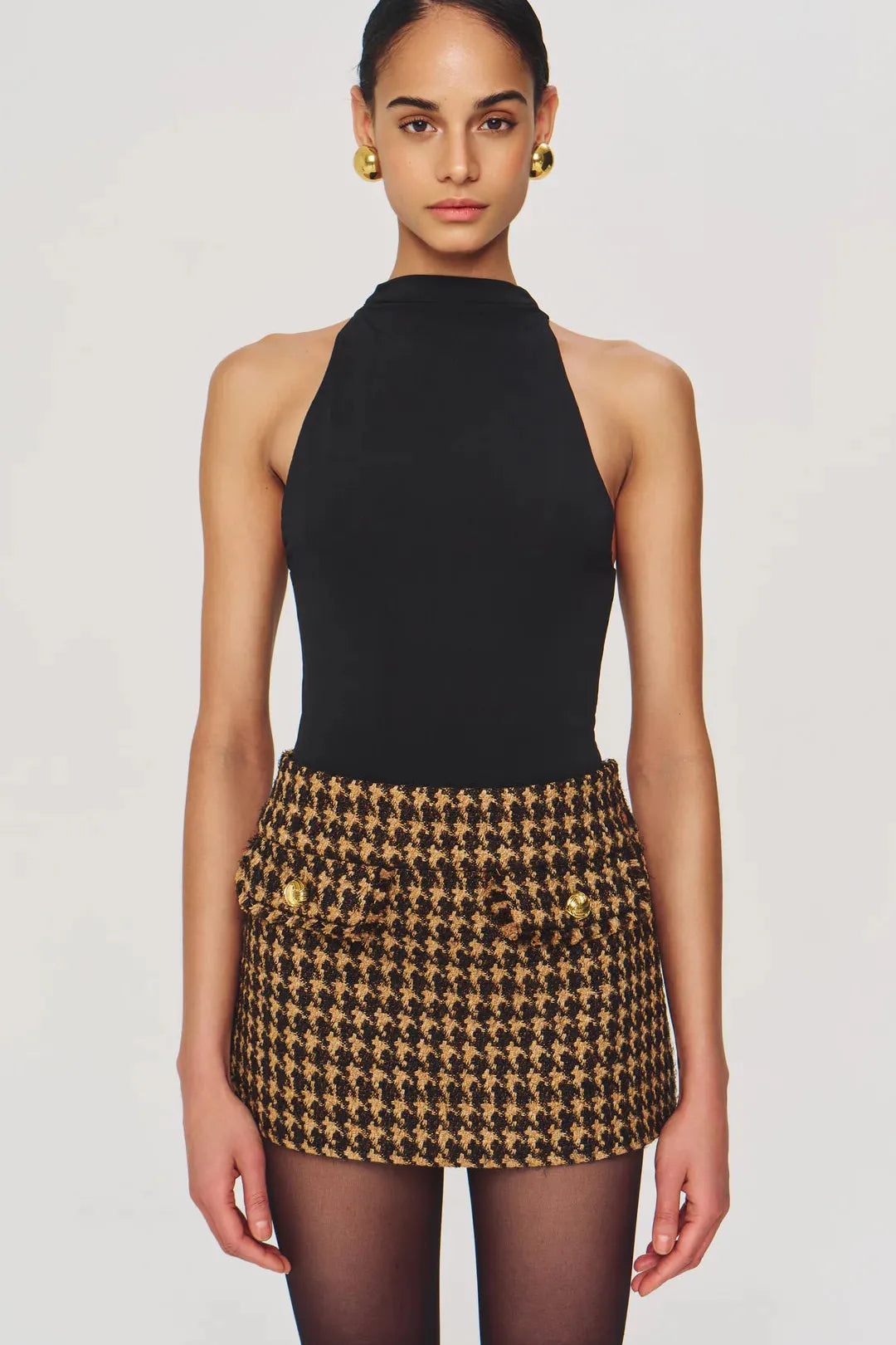 The Spen Bodysuit features a high halter neckline, designed for a smooth, body-hugging fit. It’s the essential base layer for power suiting or a sleek night-out look.